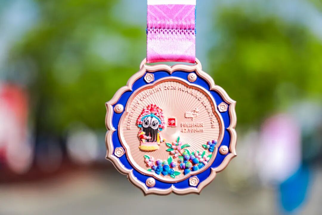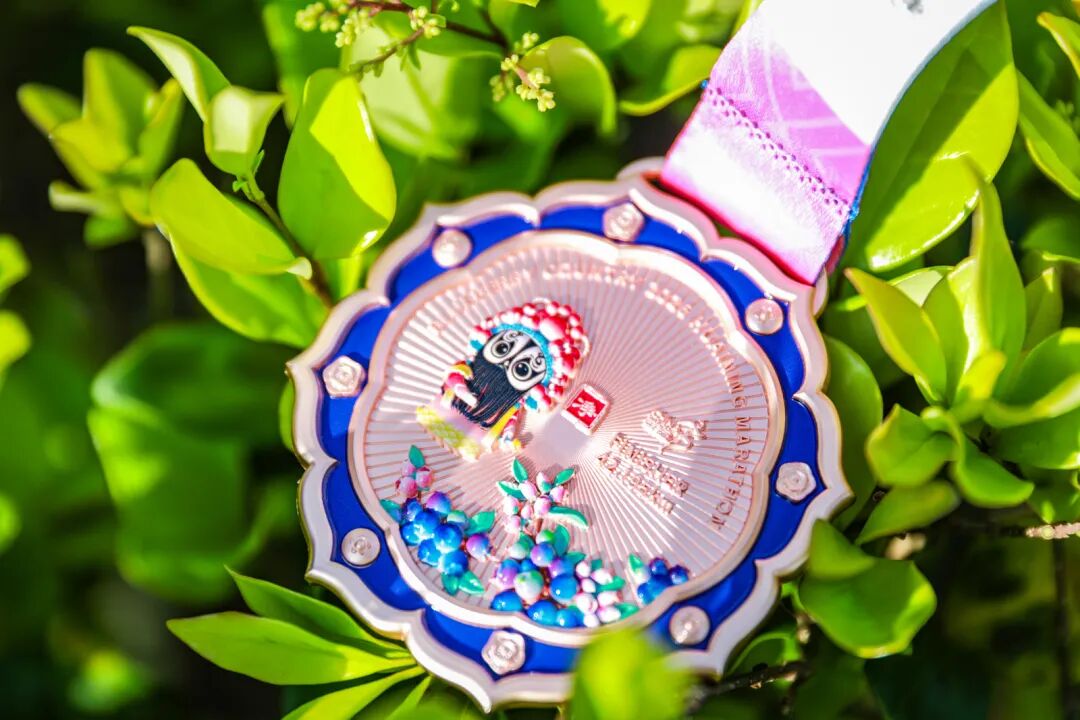 背面则以蓝莓、蓝莓花簇拥而开,一颗颗饱满果实象征着“蓝莓之乡”的丰饶;一位黄梅戏人物亭亭而立,水袖轻扬,仿佛在终点处为每一位完赛者唱一曲凯旋。