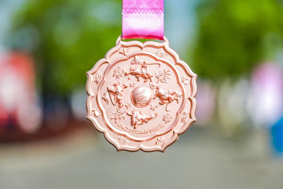 这枚奖牌,是怀宁历史底蕴与体育精神的完美交响。正面以怀宁县博物馆馆藏“唐打马球图镜”为原型,四名骑士策马击球,骏马奔腾、球杖飞扬——千年之前的大唐马球盛景,与2026马年的奔跑者隔空相望。