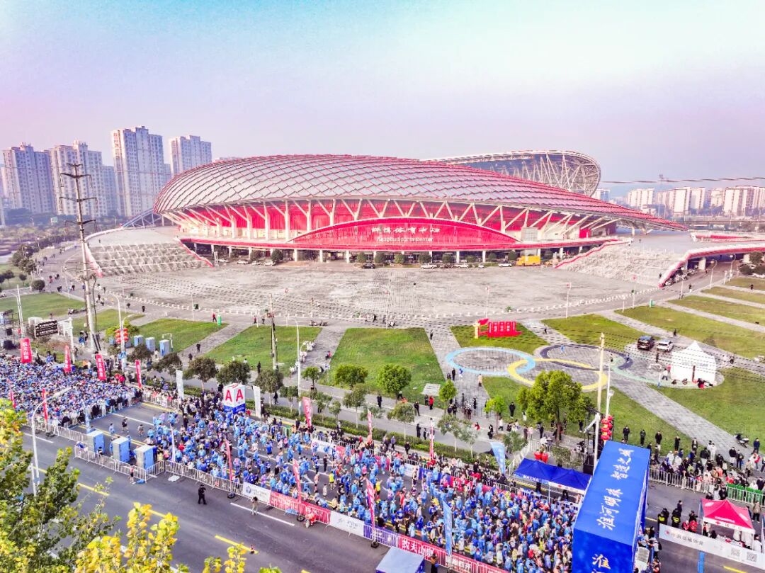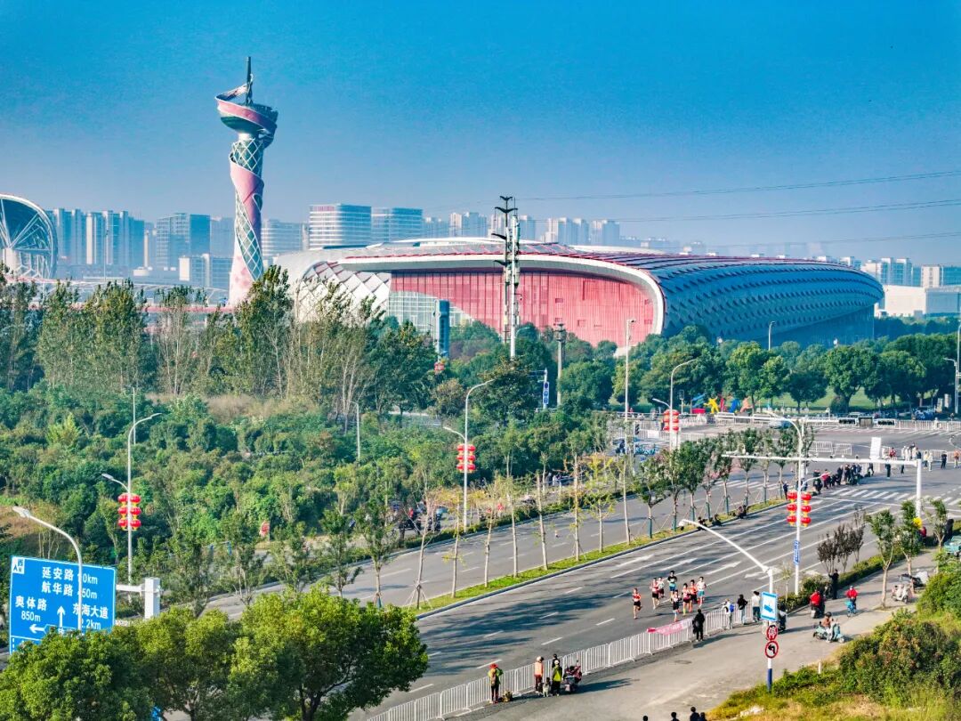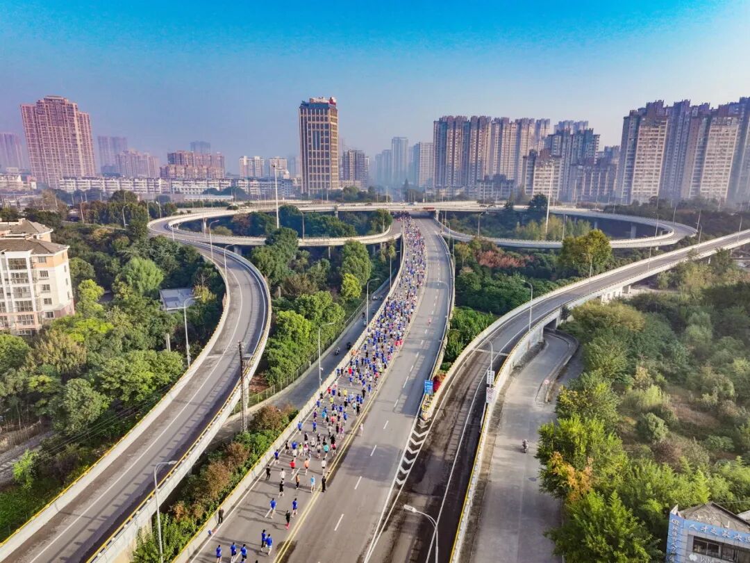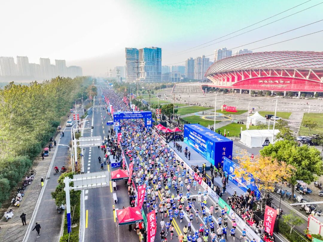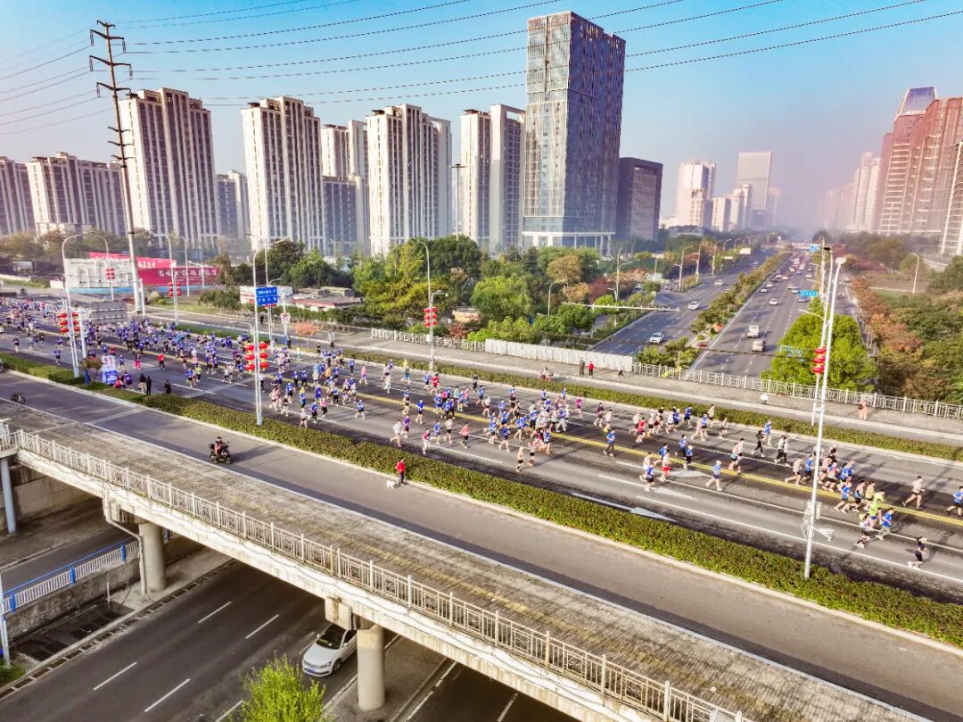 随着发令枪响,蓄势的选手们沿赛道流淌成一条蓝色的交响曲,在朝阳下跃动,与整座城市同频共振。